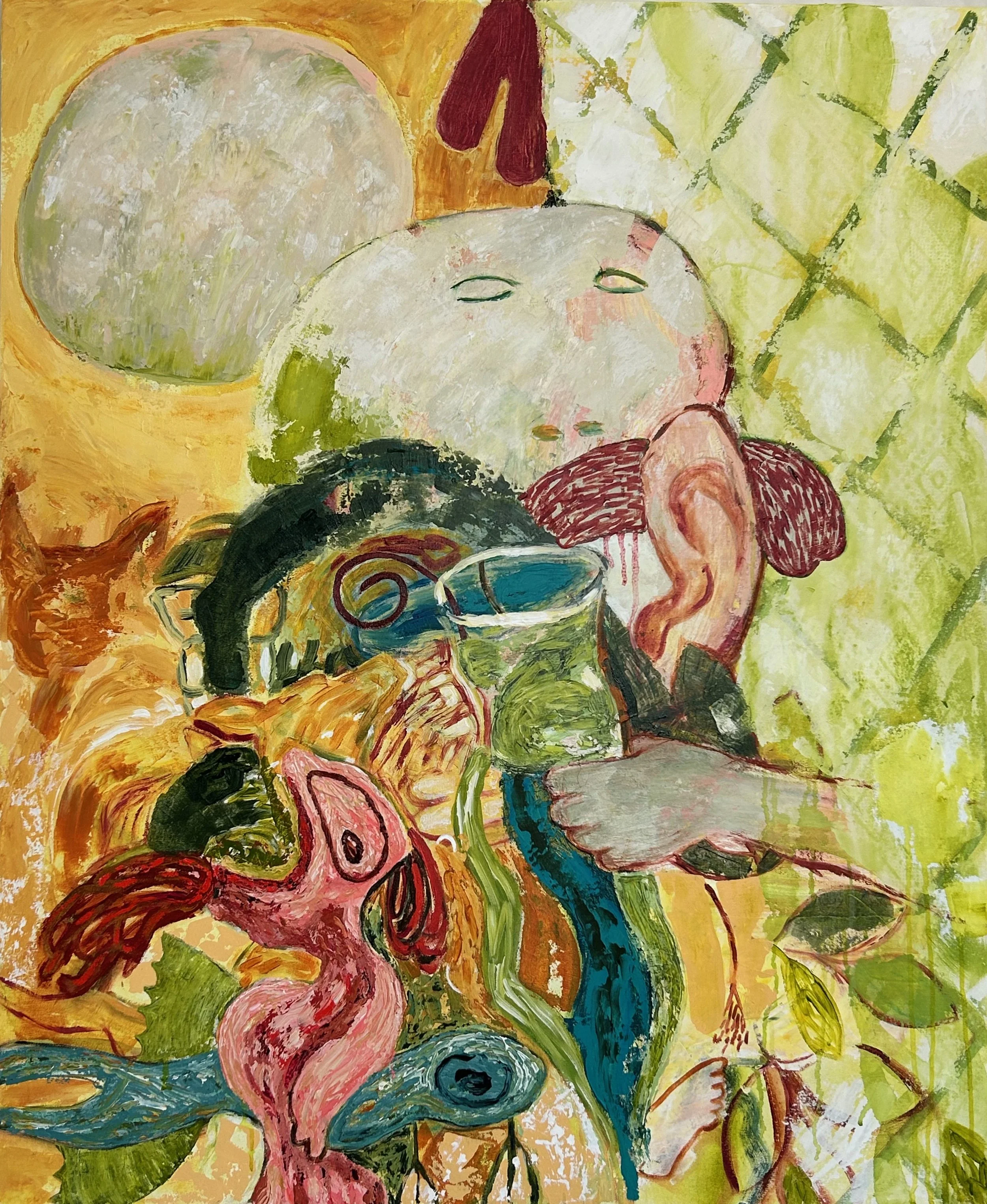 Works on this page are created in a variety of techniques, including drawing, scraping, sanding, and – painting with a brush. Intended as a kind of “anti-AI” in that the content and techniques are not predictive, the paintings are best viewed in human space.